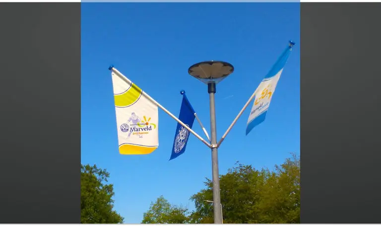 Voor Marveld Recreatie Groenlo, de Special Olympics, Internationaal Marveldtoernooi en S.V. Grol 100 jaar deze mooie kiosk vlaggen met vlaggenstok en lantarenpaal houders mogen leveren. Bent u opzoek naar mooie straatversiering of vlaggen voor uw bedrijf stuur dan een mail naar info@poelhuispromo.nl